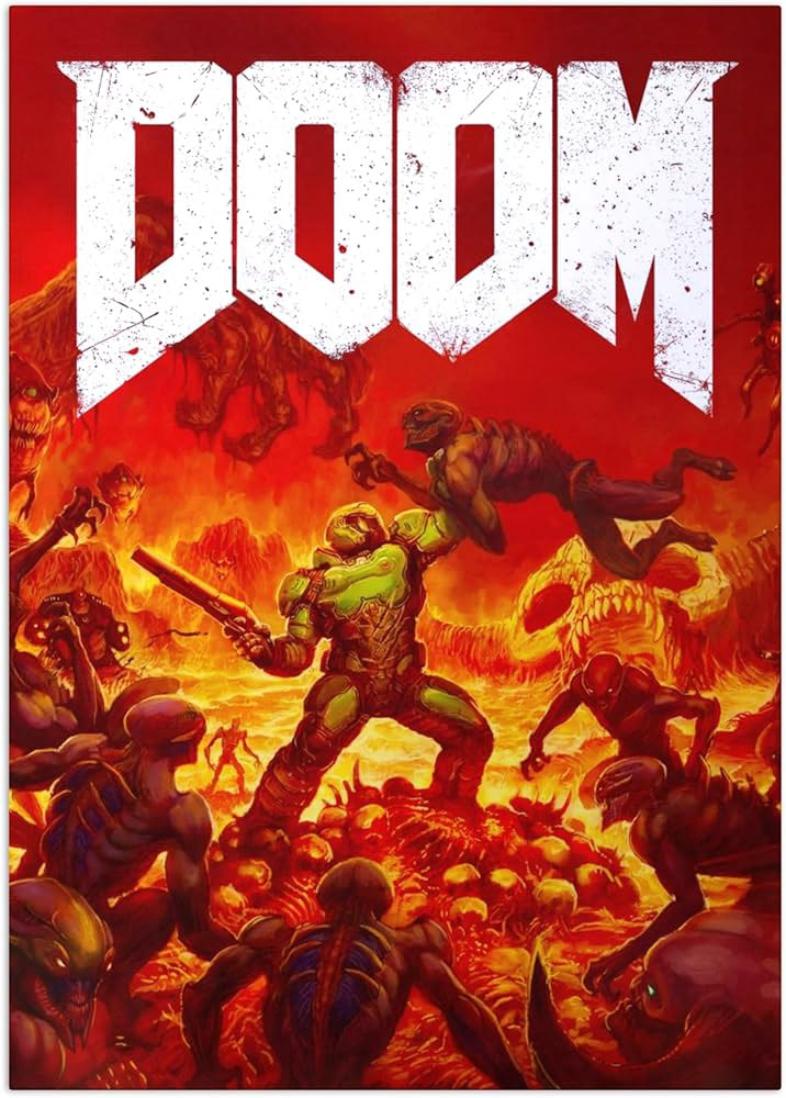 My second and final concept would be to mix grindcore band shirt style with the posing of the 2016 Doom poster. I commissioned artist Riz (RizardLiz on X/Twitter) for this art, as they are known to copy the HTF Ka-Pow! style accurately. I then added the grindcore-style lettering to the design myself.